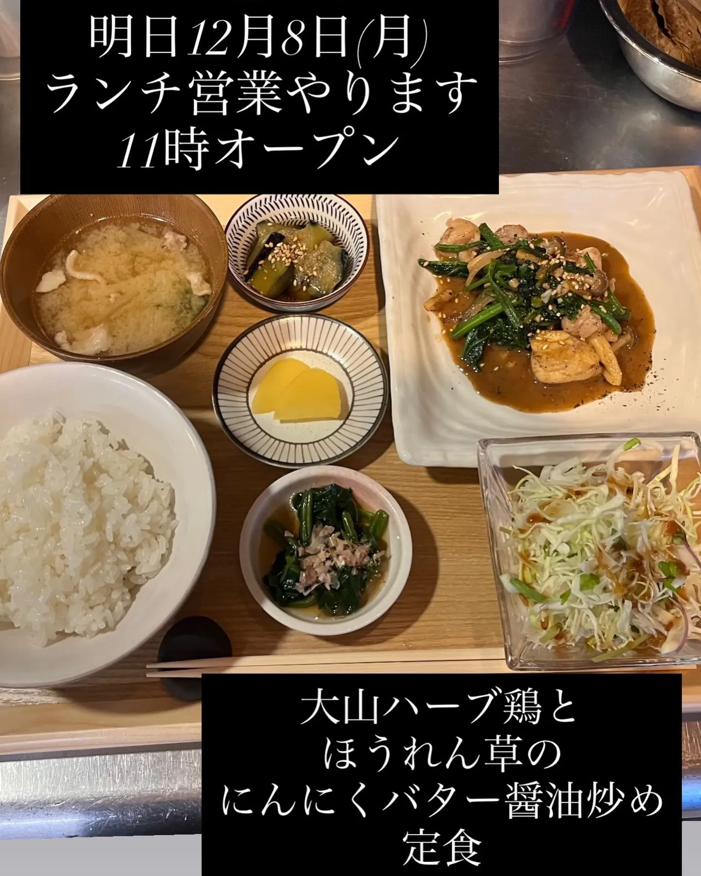 12月8日(月)ランチ営業やります 2025/12/08 12月8日(月)ランチ営業やります 11時オープン 大山ハーブ鶏とほうれん草のにんにくバター醤油炒め定食 税込1200円 お電話でご予約も承っております ご来店お待ちしております . #旬ぎく気まぐれお昼ご飯 #ランチは不定期営業 #肥後橋ランチ