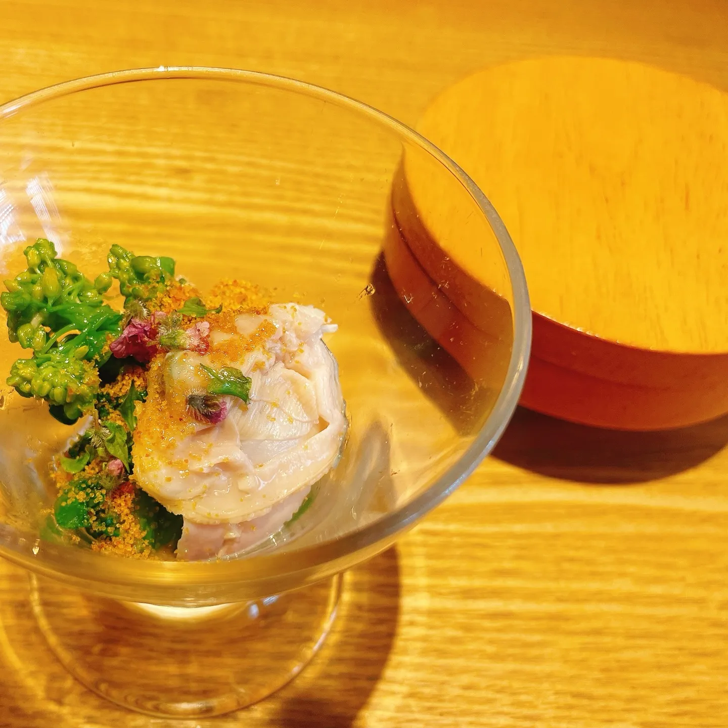 ハマグリと菜の花のカラスミがけ(瞬間スモーク)
